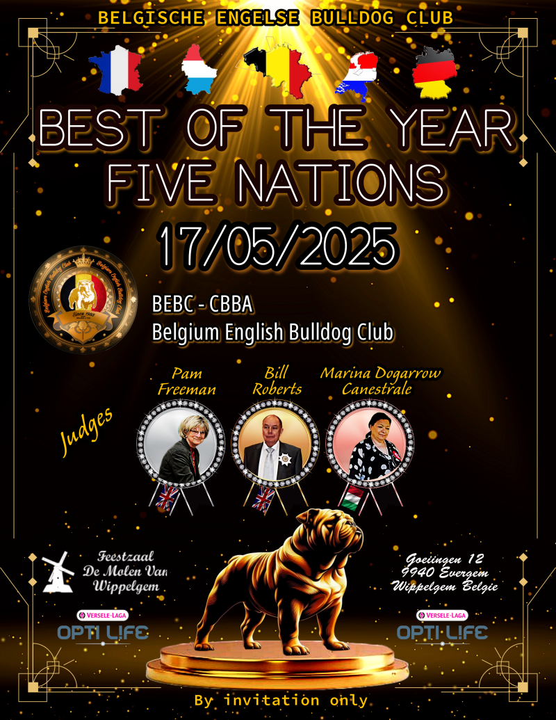Le Club Belge Bulldog Anglais organise un Best of The Year Five Nations où les chiens qualifiés sont contactés pour participer à l'événement. Cet événement est réservé à la race Bulldog Anglais. 3 spécialistes de la race sont nommés qui jugeront chaque chien individuellement.
